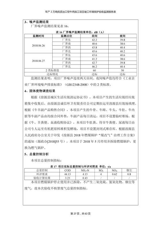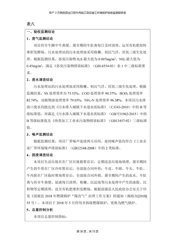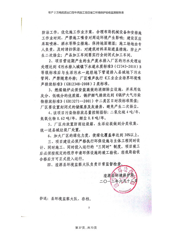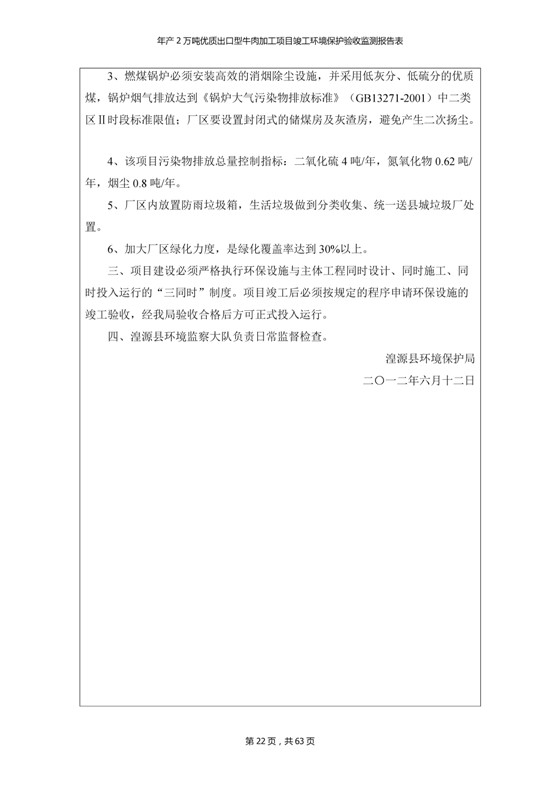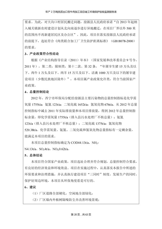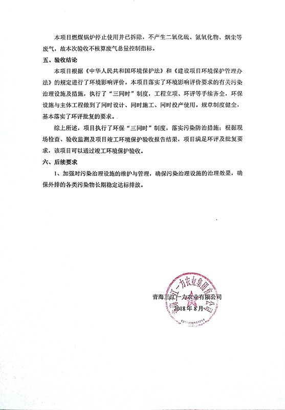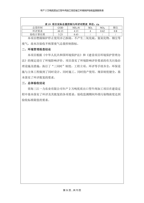 根據(jù)中華人民共和國國務(wù)院令第253號《建設(shè)項目環(huán)境保護(hù)管理條例》(中華人民共和國國務(wù)院令第682號《國務(wù)院關(guān)于修改〈建設(shè)項目環(huán)境保護(hù)管理條例〉的決定》和《建設(shè)項目竣工環(huán)境保護(hù)驗收暫行辦法》,嚴(yán)格依照有關(guān)法律法規(guī),建設(shè)項目環(huán)境保護(hù)設(shè)施驗收技術(shù)規(guī)范,本項目環(huán)評報告表和環(huán)保審批部門審批意見以及企業(yè)自行驗收相關(guān)要求等對本項目進(jìn)行驗收,本項目符合環(huán)保驗收條件,可以通過環(huán)保驗收。 青海三江一力農(nóng)業(yè)有限公司組織召開年產(chǎn)2萬噸優(yōu)質(zhì)出口型牛肉加工項目(一期工程)驗收組意見.