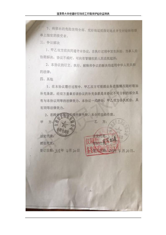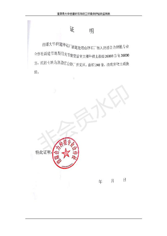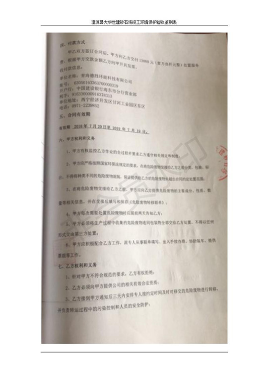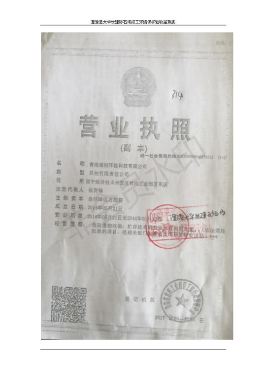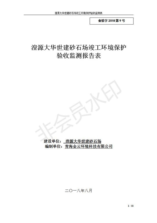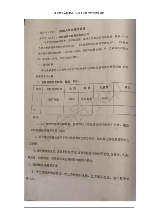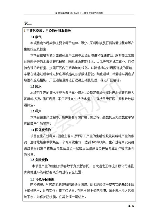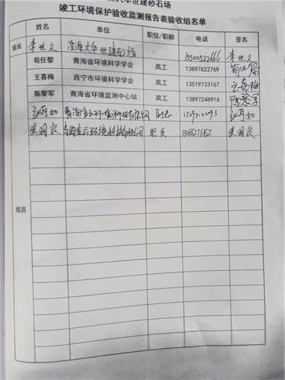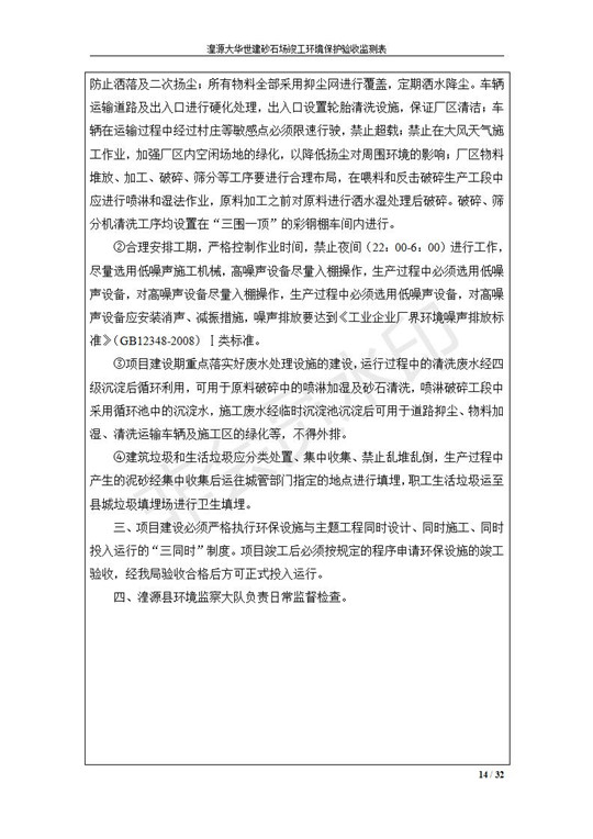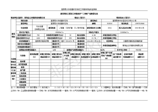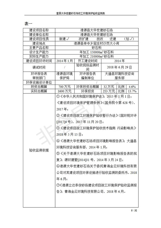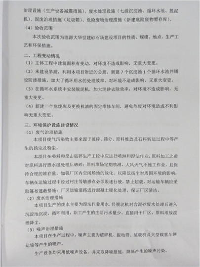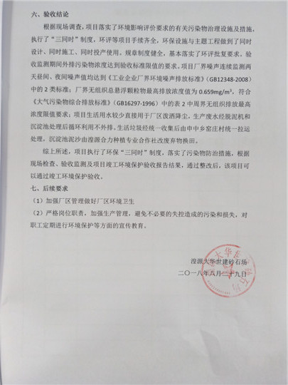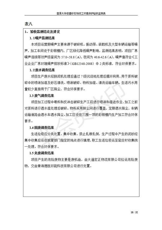 根據(jù)中華人民共和國國務院令第253號《建設項目環(huán)境保護管理條例》(中華人民共和國國務院令第682號《國務院關(guān)于修改〈建設項目環(huán)境保護管理條例〉的決定》和《建設項目竣工環(huán)境保護驗收暫行辦法》,嚴格依照有關(guān)法律法規(guī),建設項目環(huán)境保護設施驗收技術(shù)規(guī)范,本項目環(huán)評報告表和環(huán)保審批部門審批意見以及企業(yè)自行驗收相關(guān)要求等對本項目進行驗收,本項目符合環(huán)保驗收條件,可以通過環(huán)保驗收。 湟源大華世建砂石場建設項目竣工環(huán)境保護驗收意見.