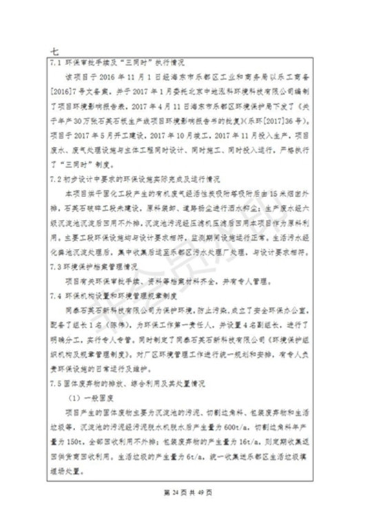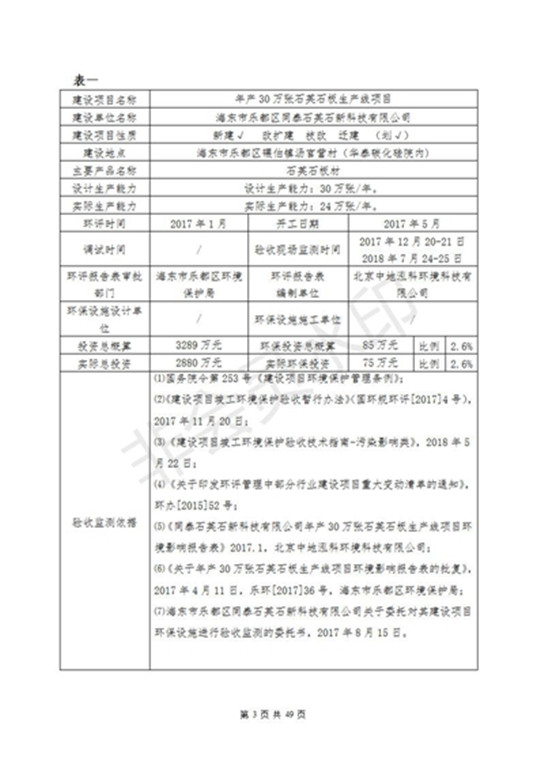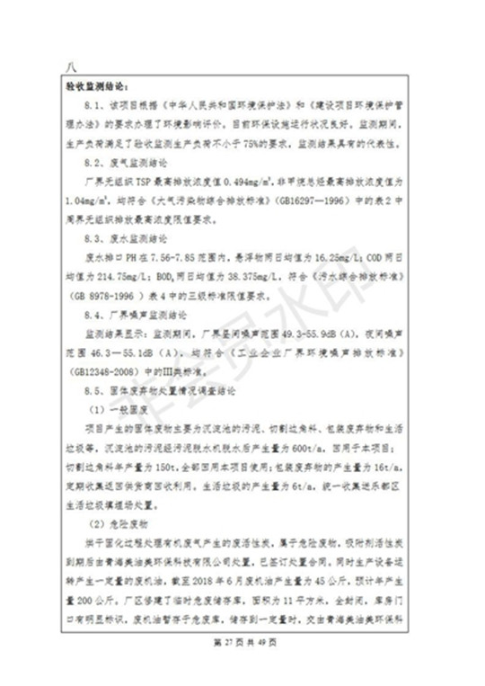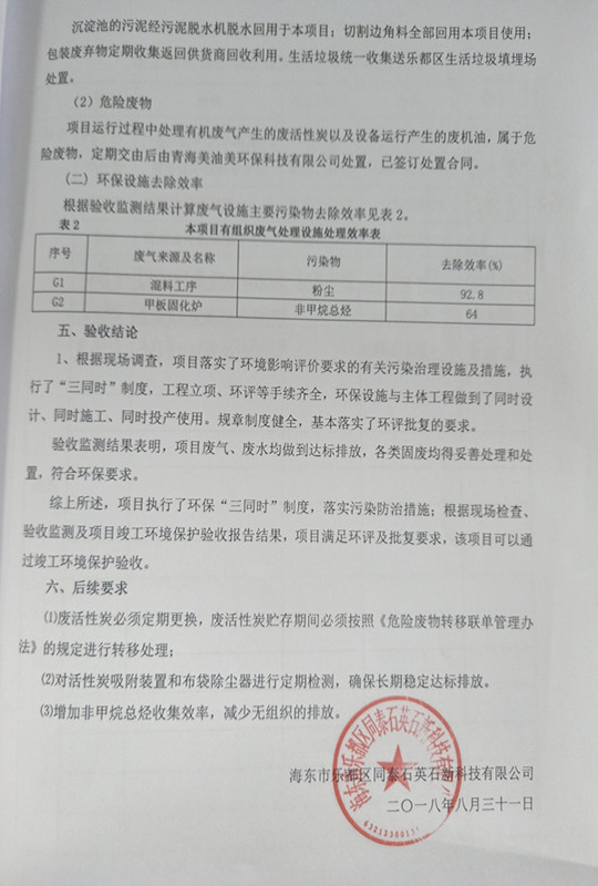 根據(jù)中華人民共和國(guó)國(guó)務(wù)院令第253號(hào)《建設(shè)項(xiàng)目環(huán)境保護(hù)管理?xiàng)l例》(中華人民共和國(guó)國(guó)務(wù)院令第682號(hào)《國(guó)務(wù)院關(guān)于修改〈建設(shè)項(xiàng)目環(huán)境保護(hù)管理?xiàng)l例〉的決定》和《建設(shè)項(xiàng)目竣工環(huán)境保護(hù)驗(yàn)收暫行辦法》,嚴(yán)格依照有關(guān)法律法規(guī),建設(shè)項(xiàng)目環(huán)境保護(hù)設(shè)施驗(yàn)收技術(shù)規(guī)范,本項(xiàng)目環(huán)評(píng)報(bào)告表和環(huán)保審批部門審批意見(jiàn)以及企業(yè)自行驗(yàn)收相關(guān)要求等對(duì)本項(xiàng)目進(jìn)行驗(yàn)收,本項(xiàng)目符合環(huán)保驗(yàn)收條件,可以通過(guò)環(huán)保驗(yàn)收。 海東市樂(lè)都區(qū)同泰科技有限公司竣工環(huán)境保護(hù)驗(yàn)收監(jiān)測(cè)報(bào)告公示