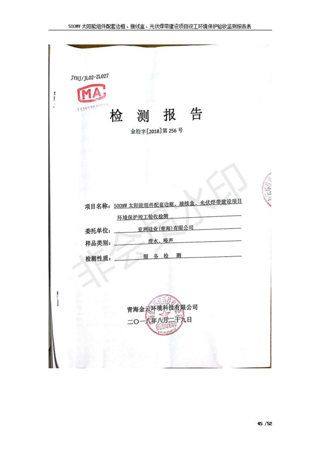 500MW太陽(yáng)能組件配套邊框、接線盒、光伏焊帶建設(shè)項(xiàng)目竣工環(huán)境保護(hù)驗(yàn)收監(jiān)測(cè)報(bào)告表公示發(fā)布日期:(2018-11-16) 點(diǎn)擊次數(shù):2202 |